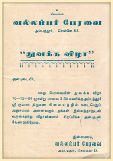 முதல் கூட்டம் அம்பத்தூர, வரதராஜபுரம், No:19, G.N.G. தெருவில் இருந்த மாடியில் நடந்தது. அதில் 40 பேர் கலந்து கொண்டனர். இரண்டாம் கூட்டம் அம்பத்தூர, வரதராஜபுரம, ஹரி கிருஷ்ண நாயுடு